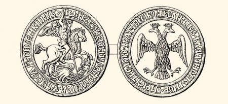Двуглавый орел в России впервые появляется на государственной печати Великого князя Ивана III в 1497 году. Печать была двусторонняя: на лицевой стороне изображался всадник, поражающий копьем змея - символ великокняжеской власти, а на оборотной стороне - двуглавый орел.