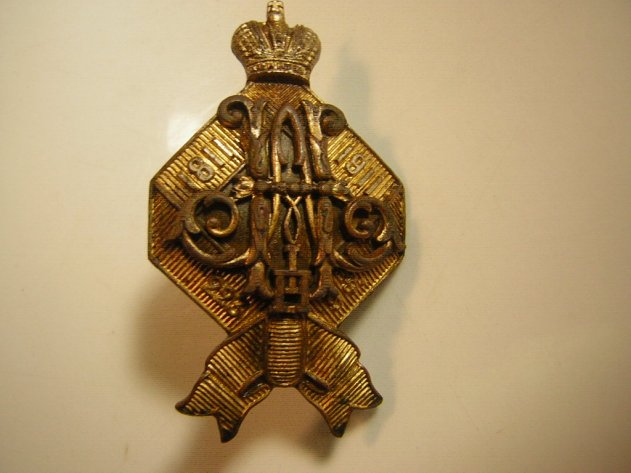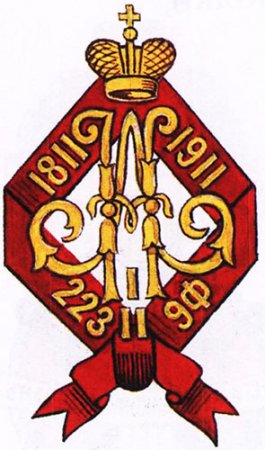 Утвержден - 15.04.1911 г. Золотые соединенные вензеля Императоров Александра I и Николая II под золотой Императорской короной положены на сложенную венком Александровскую (красную) юбилейную ленту с надписями золотом: «1811-1911», «223» (из 223-го пех. резервного Коротоякского полка в 1910 г. был сформирован данный полк) и «9 Ф».