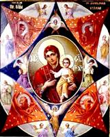 Хотелось бы особо обратить внимание на конфигурацию темного и светлого квадрата внутри «орнамента» паспорта. Налицо неоспоримое сходство с формой плат с изображением небесных сил на иконе Божией Матери «Неопалимая Купина», которые в иконографии называются мандорла. (рис.10) Сходство конфигураций наводит на мысль, что печать «тайны беззакония» в российских паспортах готовили с учетом православной специфики русского народа. Ведь именно Россия считается четвертым уделом Пресвятой Богородицы. Изображая внутри «змея»в «огненном озере мандорлу «Неопалимую Купину» художник указывает на то что «шестая часть земли с названьем сладким «РУСЬ» завоевана и находится в плену, в оккупации тёмных сил зла.