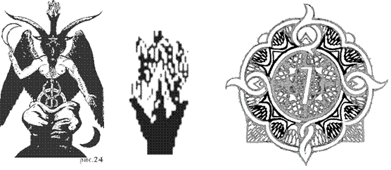 Таково извращение «сборищем сатанинским» Слова Божия. Таково безумно - кощунственное присвоение сатаною того, что Божие, что принадлежит только Тому, кто есть истинно Альфа и Омега, Первый и Последний. Обратимся теперь к внешним виньеткам «орнамента». Не составляет особого труда видеть, что слева, сверху, и справа изображены только верхняя буква α(альфа), как символ Триипостасного Бога (Пресвятой Троицы), на каждую из которых наложена виньетка в виде цифры «шесть» (на рис.7 выделена только левая«6»).
