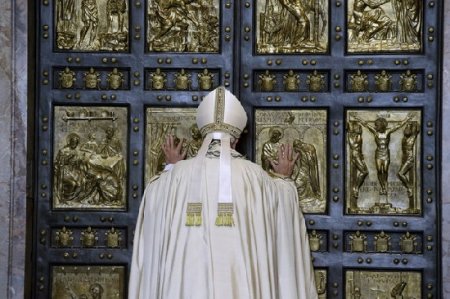 Папа Римский Франциск перед закрытыми святыми дверями в Собор Святого Петра.