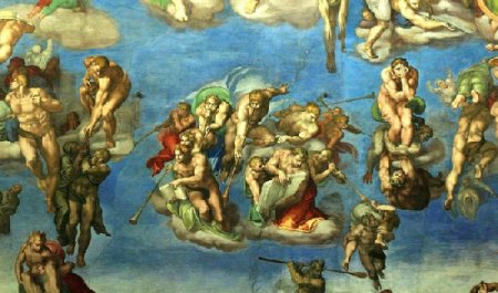 Ватикан. Сикстинская капелла, картина «Страшный суд» (Микеланджело): вестники Апокалипсиса трубят о Страшном суде.