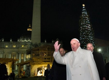 Ватикан, 31 декабря 2015 года. Фото Папы на площади Святого Петра, на фоне новогодней елки.