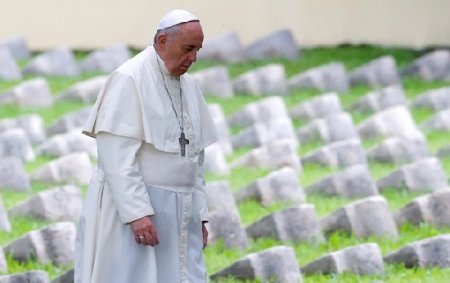 Тут тоже все понятно: 2014 год. Фото Папы на австро-венгерском кладбище в Редипулье на северо-востоке Италии, где он принял участие в торжественной мессе и где он обратился к 10 тысячам верующих собравшихся на кладбище, и предупредил, что начинается тяжелое, катастрофическое время войн и бедствий.