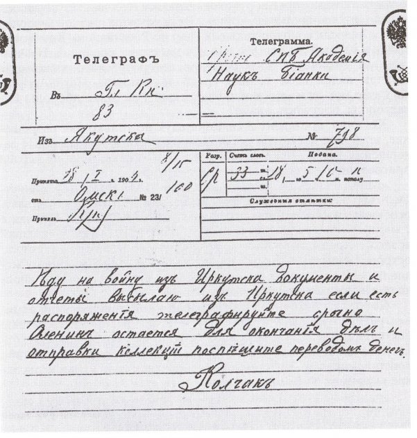 Александр Васильевич Колчак, как только началась Русско-японская война (не вылечившись до конца) - в марте 1904 г. отправляется в Порт-Артур служить под началом адмирала Макарова. После трагической гибели Макарова - Колчак командует миноносцем "Сердитый", совершившим ряд смелых нападений на сильнейшую эскадру противника. В ходе этих боевых операций было повреждено несколько японских кораблей и потоплен японский крейсер "Такосаго". За это он был награжден орденом Св. Анны 4-й степени. В последние 2,5 месяца осады Порт-Артура Колчак успешно командует батареей морских орудий, которые нанесли самые большие потери японцам. За оборону Порт-Артура Колчак был награжден Золотым оружием с надписью "За храбрость". Уважая его храбрость и талант, японское командование одному из немногих оставило Колчаку в плену оружие, а потом, не дожидаясь окончания войны, предоставило ему свободу. 29 апреля 1905 г. Колчак вернулся в Санкт-Петербург.