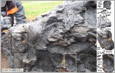 Когда я подошёл к камню, я немного оробел: он оказался мокрым и блестел, как зеркальный. Хотя я взял с собой рисунок со своей дешифровкой, однако отождествить с реальными фрагментами камня мне его не удалось: рисунок пропечатался очень бледно, а камень выглядел очень непривычно. Тем не менее, приглядевшись, я обнаружил ряд ликов и надписей и попросил оператора снять их в режиме макросъёмки.