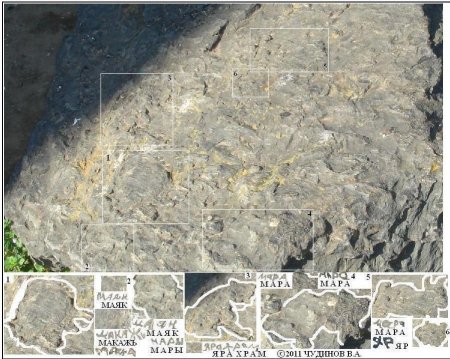 Разумеется, на этом снимке я выявил далеко не все лики. Но моё внимание привлек фрагмент в белой рамочке справа вверху, где я выявил зооморфный лик Мары в виде головы козы в профиль, с разворотом вправо, с открытым ртом, демонстрирующем зубы и с почти горизонтально вытянутой белой борой. Изображение очень реалистично. Это – Мара в виде «козлика». Над головой можно прочитать надпись ЛИК МАРЫ, на верхней части лба – подпись МАРА, под бородой – слова ЯРА МАРА. Все надписи – достаточно мелкие, их впору изучать под лупой (что я и сделал на объекте).