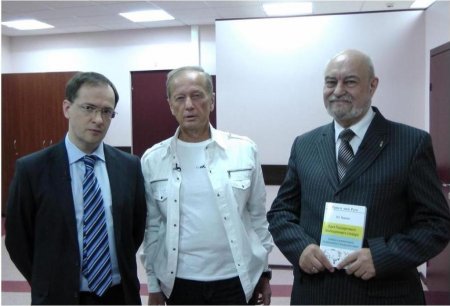 Но вот подошла женщина-администратор и через сложную систему переходов привела меня в комнату рядом со студией № 14; при этом Живов с его провожатой отпали где-то по пути. Оказалось, что комната, где я имел возможность снять пальто и шляпу, предназначалась всего для трёх лиц; выяснилось, что Михаил Николаевич Задорнов специально ради данной съёмки прилетел из Латвии, где проживал последнее время, и теперь постепенно продавливается через пробки на шоссе от аэропорта Шереметьево до Телецентра. Словом, Таисия меня очень порадовала. Отбиваться от противников в одиночку, без Задорнова, было бы для меня весьма сложно. Однако неожиданно в эту комнату вошло еще одно лицо, с которым мы, как я помню, летом пересеклись на съёмках в павильоне на метро Алексеевская. Это был Владимир Ростиславович Мединский.