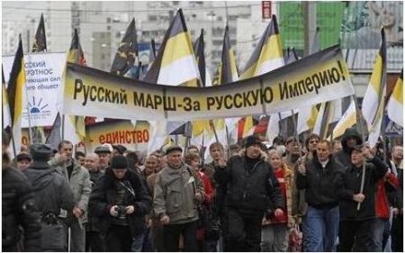 Для начала передачи ведущие решили показать кадры из «Русского марша» конца 2010 года. Я нашел несколько иллюстраций в НТВ, примерно соответствующих показанным на экране. На переднем плане мы видим лозунг: «За русскую империю» - весьма расплывчатого содержания. Что именно имеется в виду – Русская империя образца начала ХХ века с самодержцем во главе? Или территория Русской империи, включая среднеазиатские губернии, а также Прибалтику, Польшу и Финляндию? Или стиль управления в духе римского слова «империя»? Или примат русского населения над населением «инородцев»? Естественно, что каждый участник данного ток-шоу мог выбрать свой аспект рассмотрения и дать свой ответ.