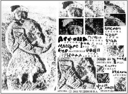 В фильме были показаны и славянские изображения. Хотя город назван не был, но я сразу узнал изображение из городка Альтенкирхен, а также на стеле из Арконы. Эту стелу с моим чтением надписей я показывают тут. Павел совершенно ничего не знал о том, что многие надписи на славянских изображениях читаются, и притом – по-русски. Впрочем, для человека, который до сих пор занимался на НТВ посадками на огороде, а теперь перешел к славянской проблематике, это не удивительно. Гораздо более удивительно другое – пробуждение его интереса к древней истории Руси. Если таково мнение не только его, но и всего канала НТВ, это можно только приветствовать.